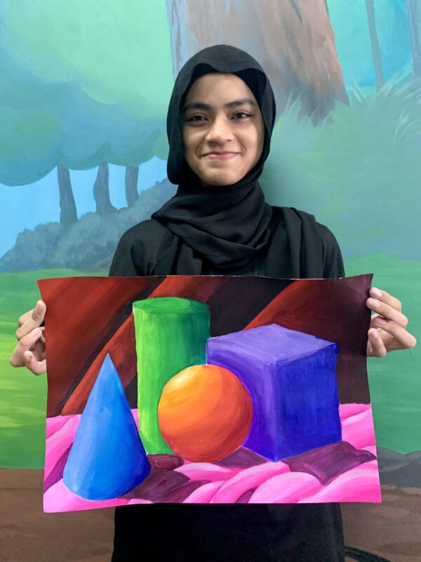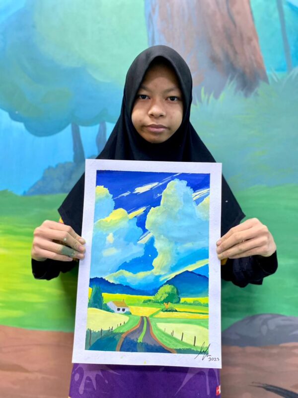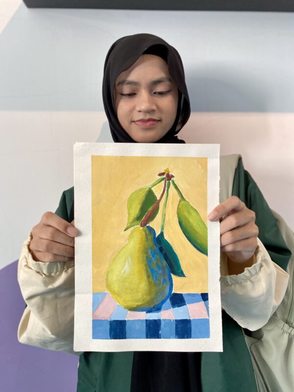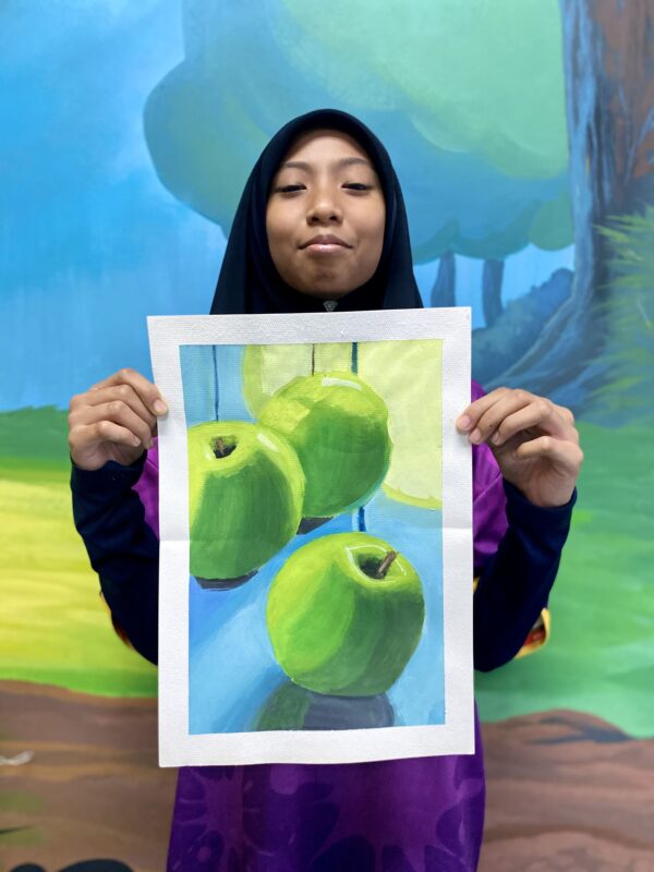 Pelajar diajar teknik mewarna pemandangan dan still life drawing.